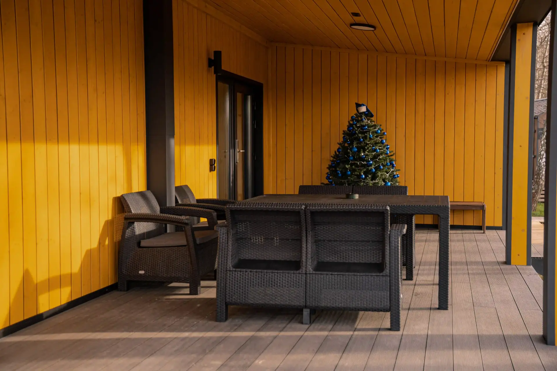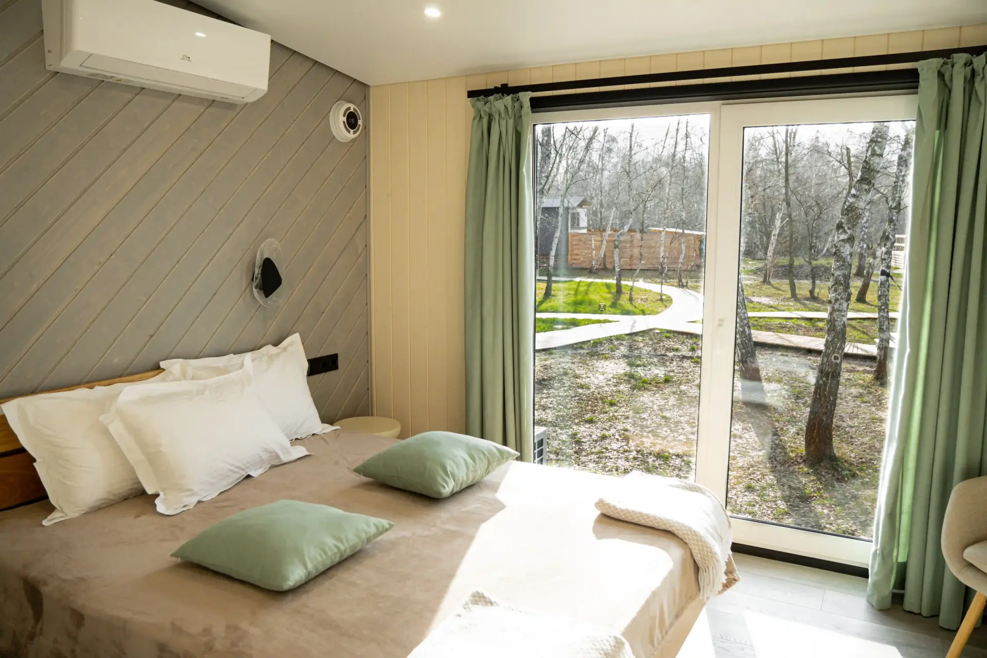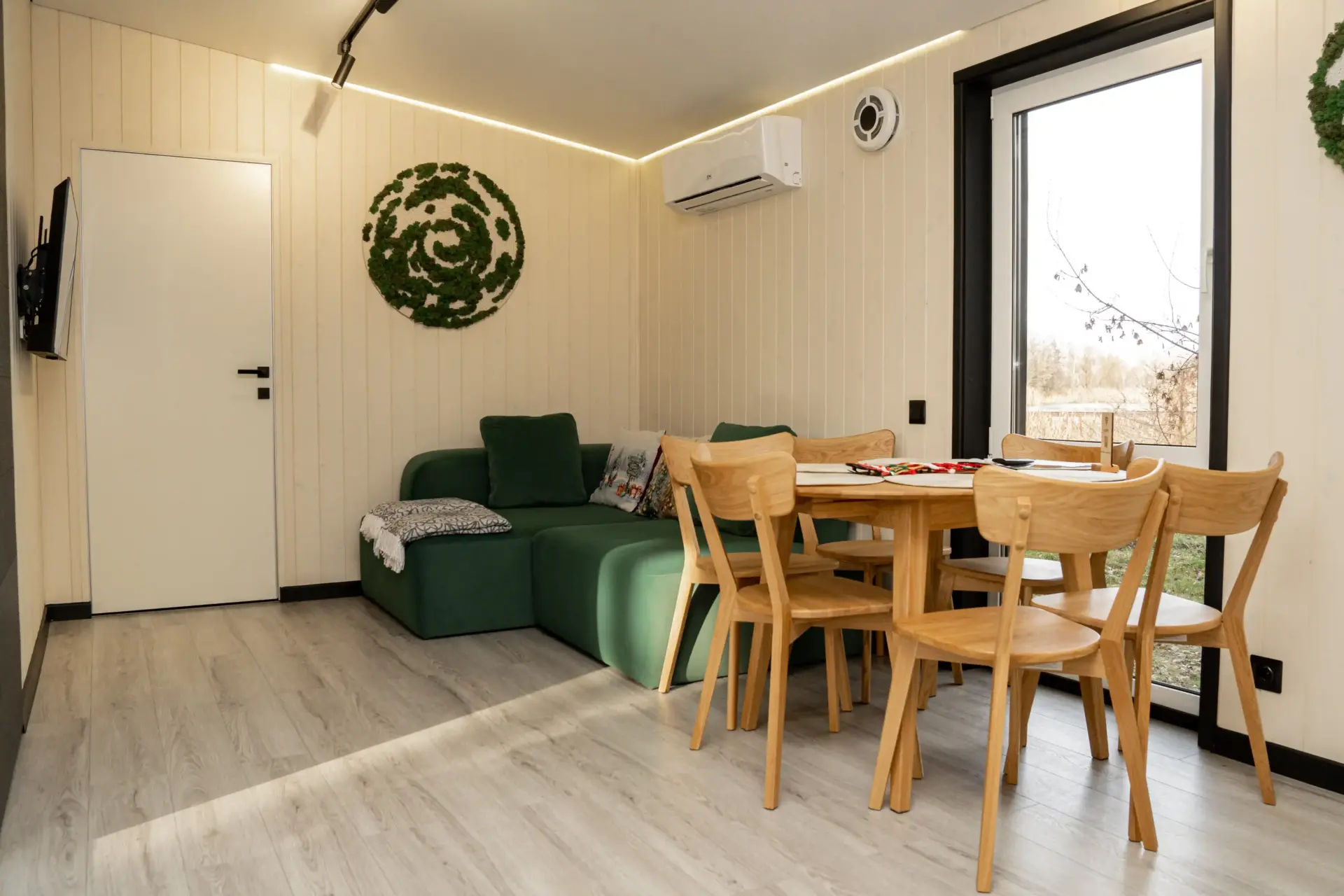 Будиночок «Ранкова Роса» передає атмосферу свіжості й легкості. Світлий інтер’єр наповнює простір комфортом, а зручне планування з двома спальнями та затишною вітальнею ідеально підходить для великої родини чи компанії друзів, які хочуть відпочити разом серед тиші та природи.