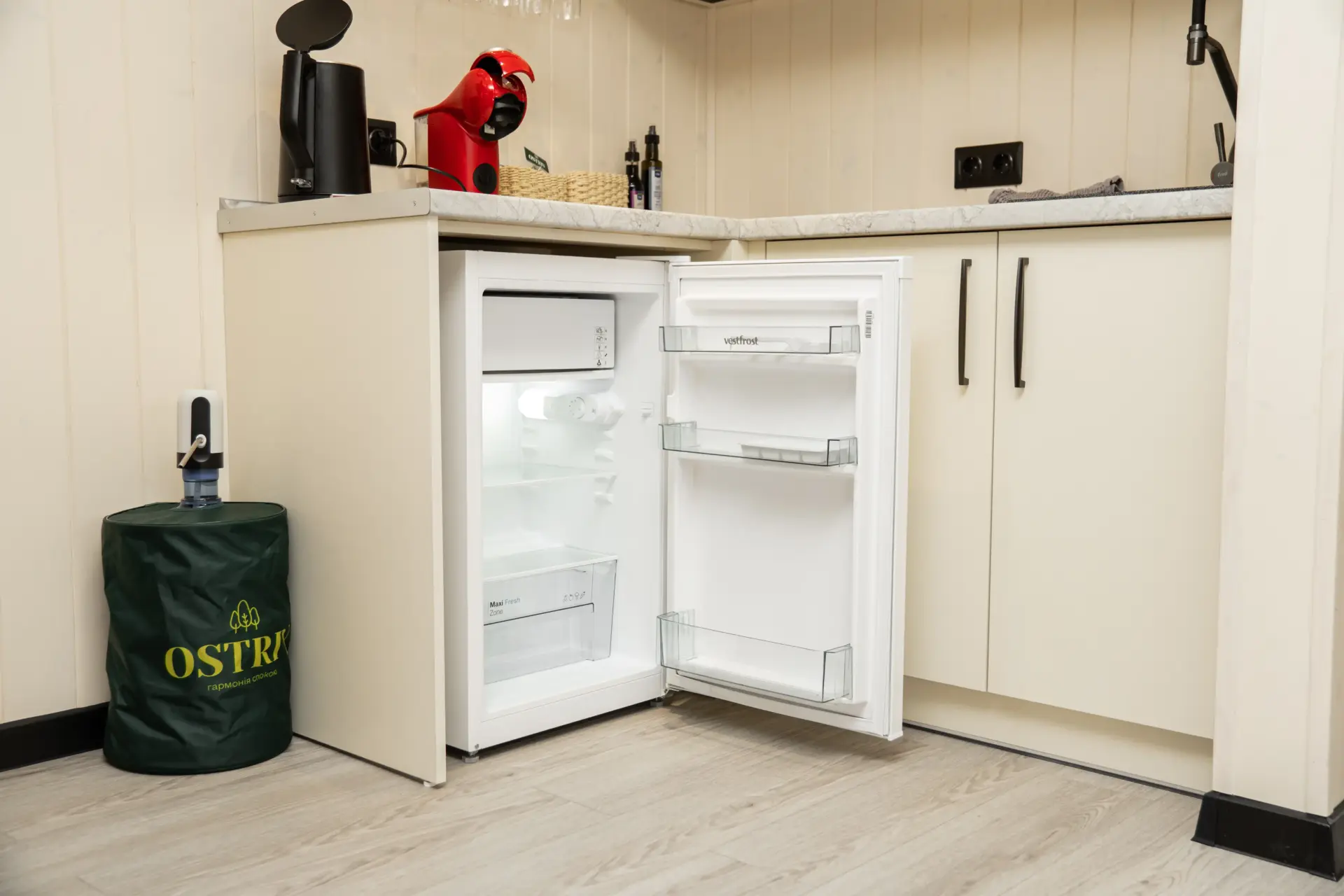 - Кухня (індукційна плита, мікрохвильова піч, чайник, кавомашина, холодильник, мийка)