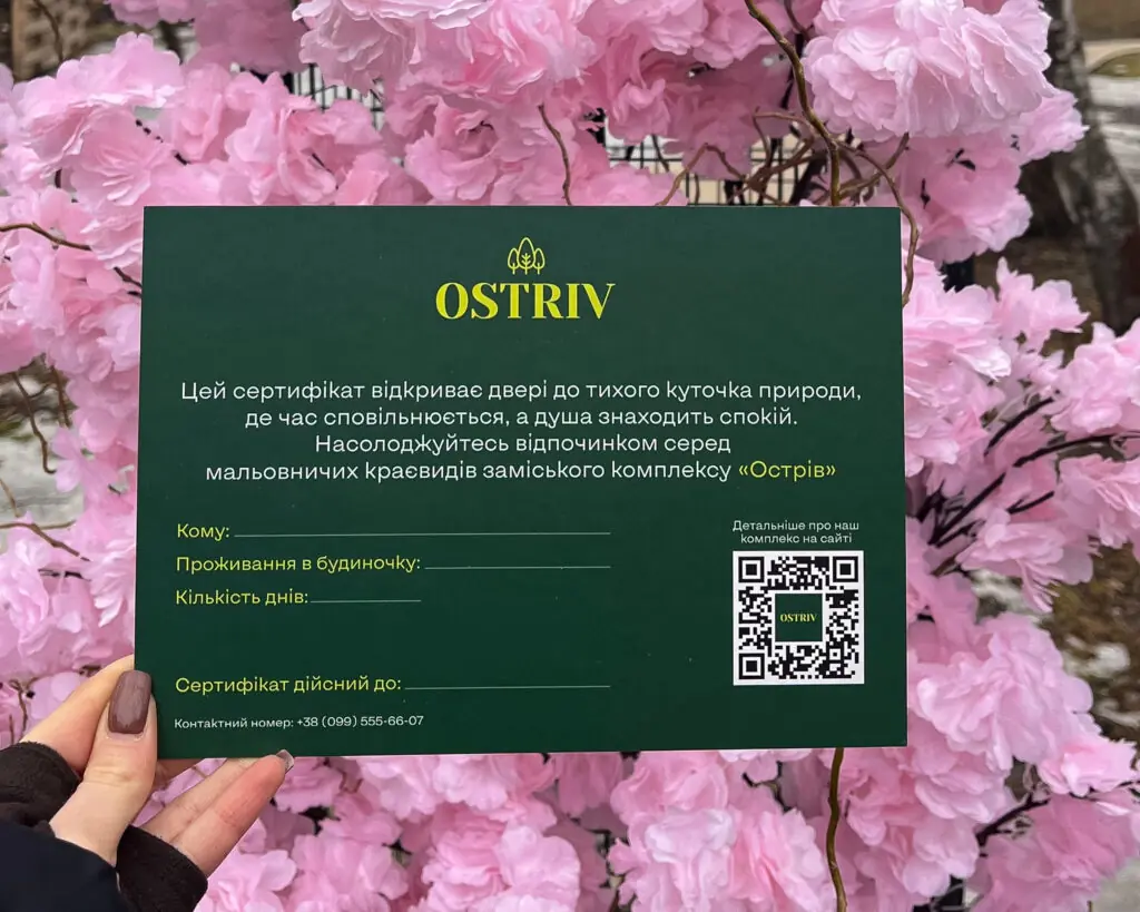 Подарунковий сертифікат — це не просто подарунок, а можливість подарувати час для відпочинку, нові емоції та атмосферу спокою. Саме такі подарунки залишаються у пам’яті надовго.Замовити подарунковий сертифікат до 8 березня можна: